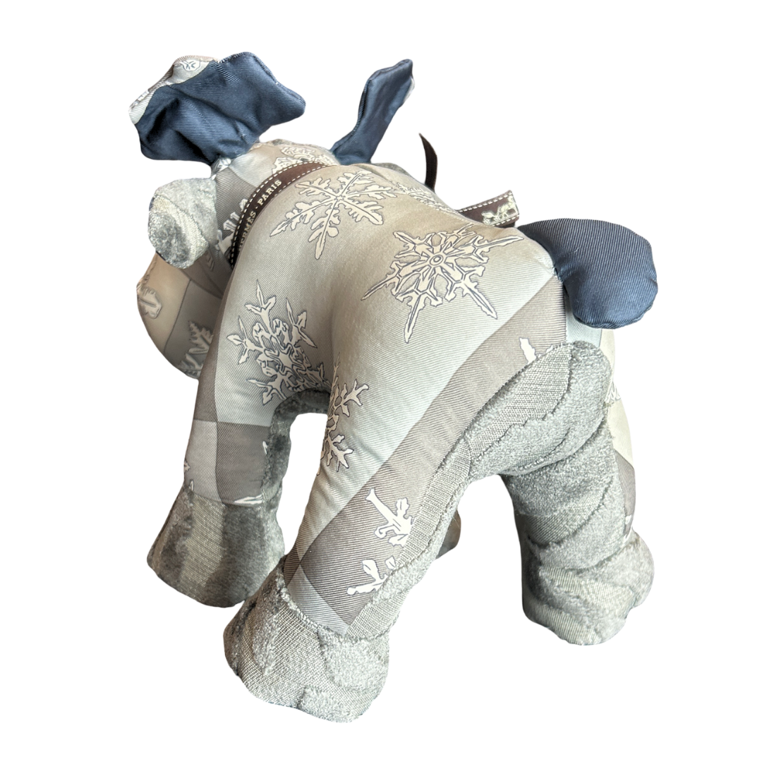 Vintage Hermes Feux d'Hiver silk scarf paired with velvet cloth handmade into a one of a kind animal. Non-Allergenic polyfill stuffing. For decorative use only.