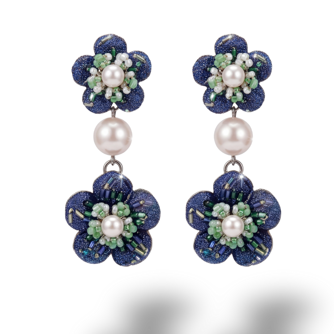 Vintage Hermès silk neckties paired with poly nylon pompoms, glass pearls, enamel and rhinestone flowers and hypoallergenic stainless-steel pierced earring posts.