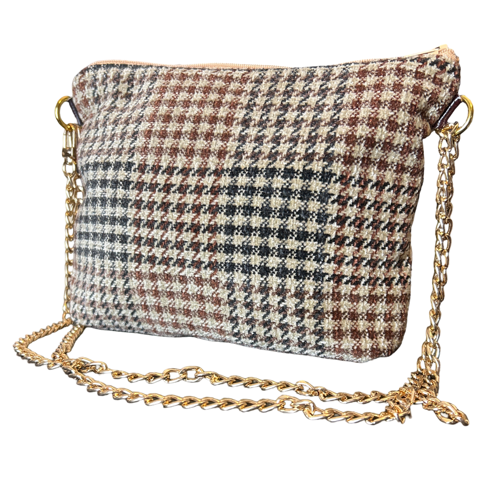 Vintage Hermes Cannes et Pommeaux silk scarf front paired with coordinating tartan plaid reverse. Fully lined, zippered closure with removable 23" drop gold-tone crossbody chain.
