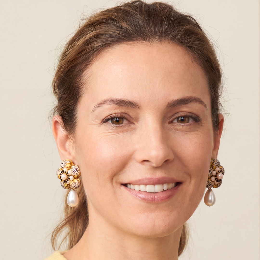 Vintage Chanel silk neckties paired with poly nylon pompoms, glass pearls, enamel and rhinestone flowers and hypoallergenic stainless-steel pierced earring posts.