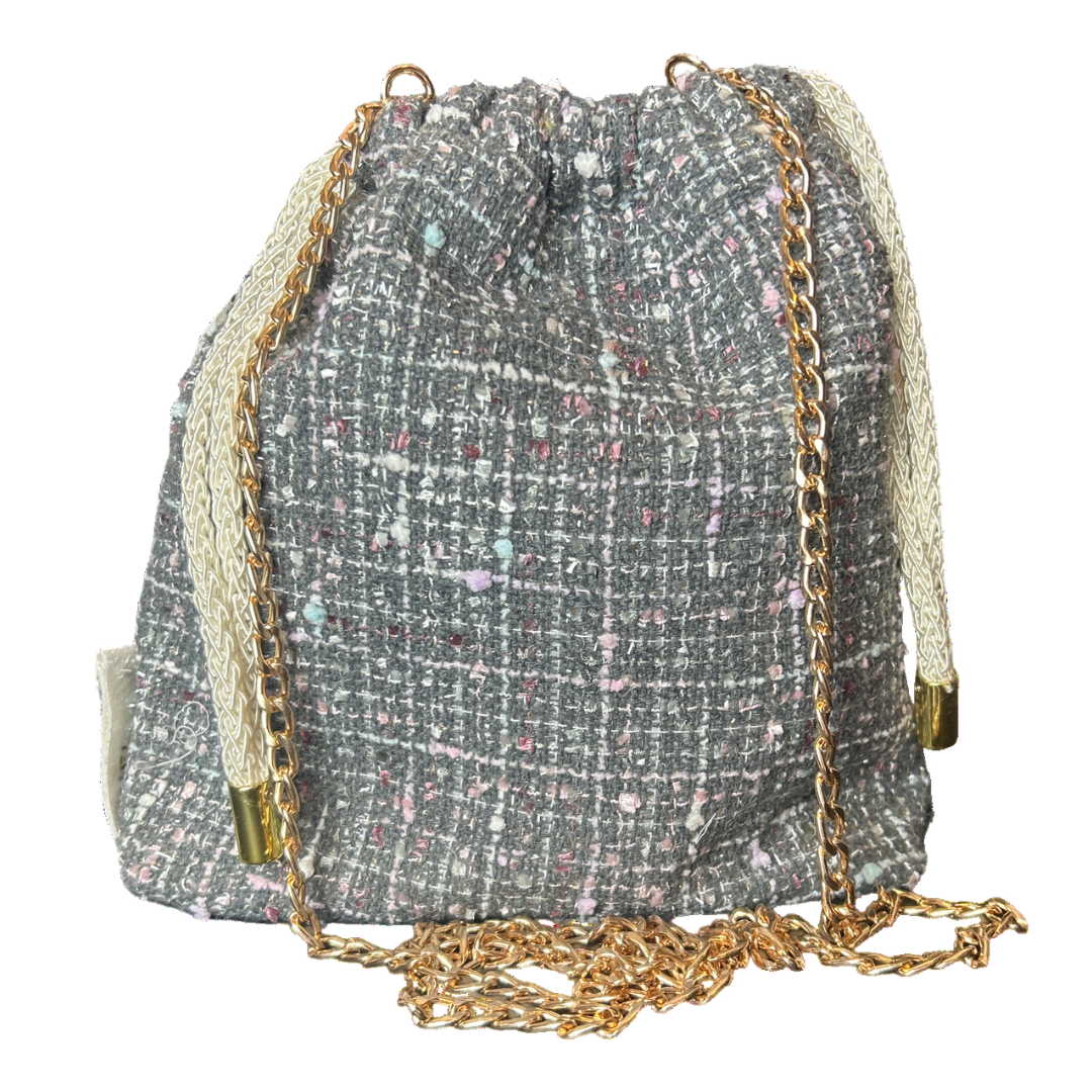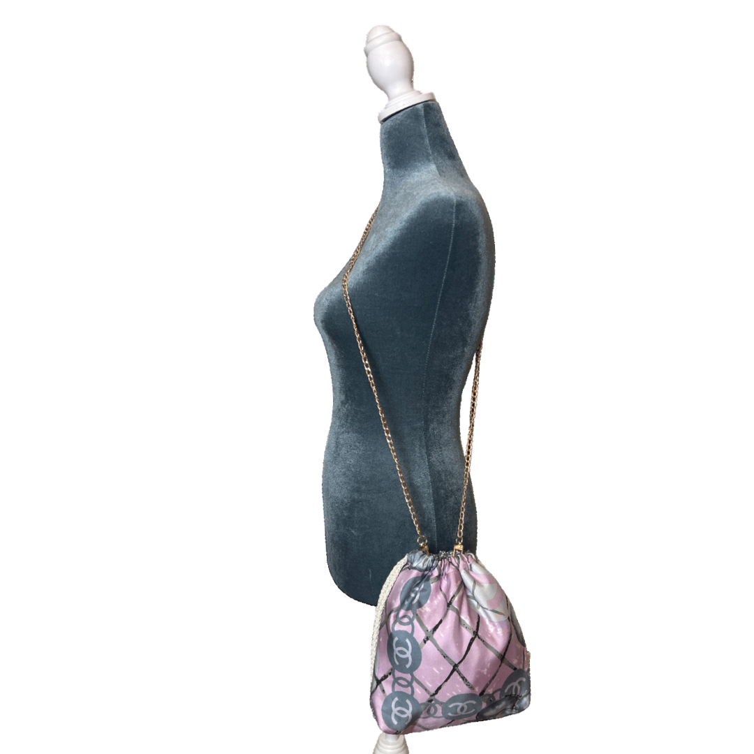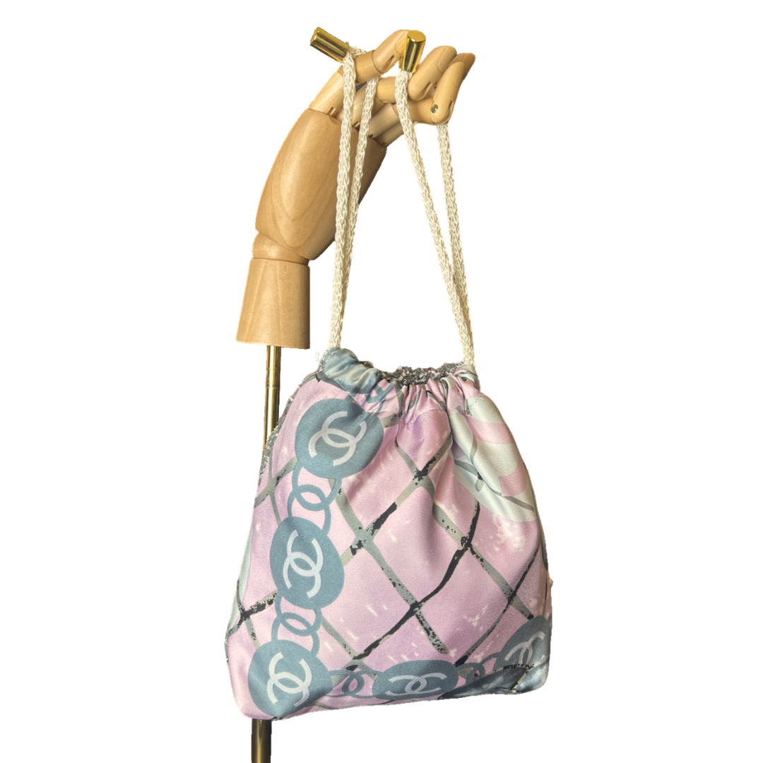 Reimagined from the world’s finest collection of vintage Chanel scarves, our drawstring bag is the ultimate accessory for your on-the-go lifestyle.  Uniquely convertible from a crossbody to a handheld bag with both removable goldtone chain and silky drawstring cord.