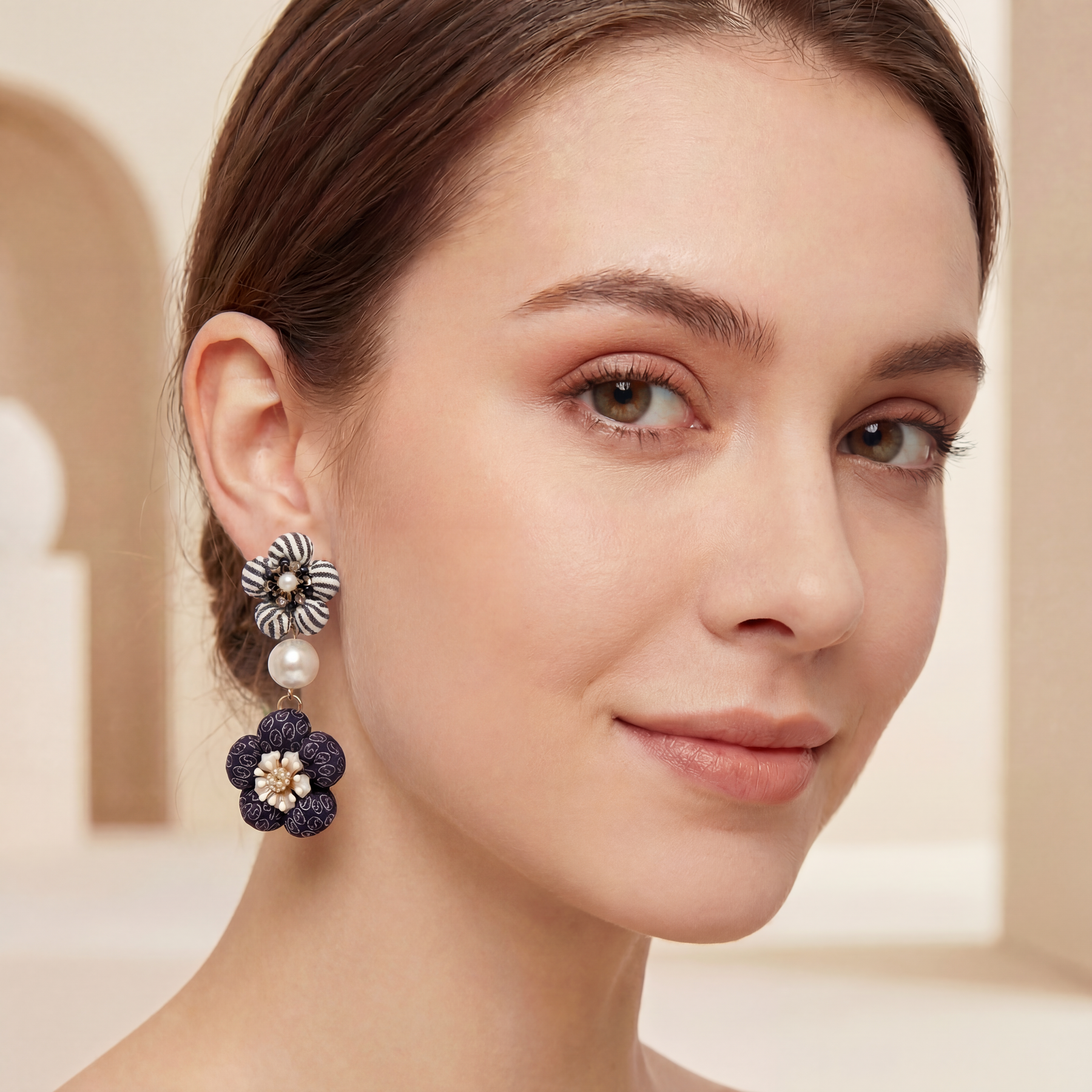 Vintage Gucci & Ferragamo neckties paired with poly nylon pompoms, glass pearls, enamel and rhinestone flowers and hypoallergenic stainless-steel pierced earring posts.