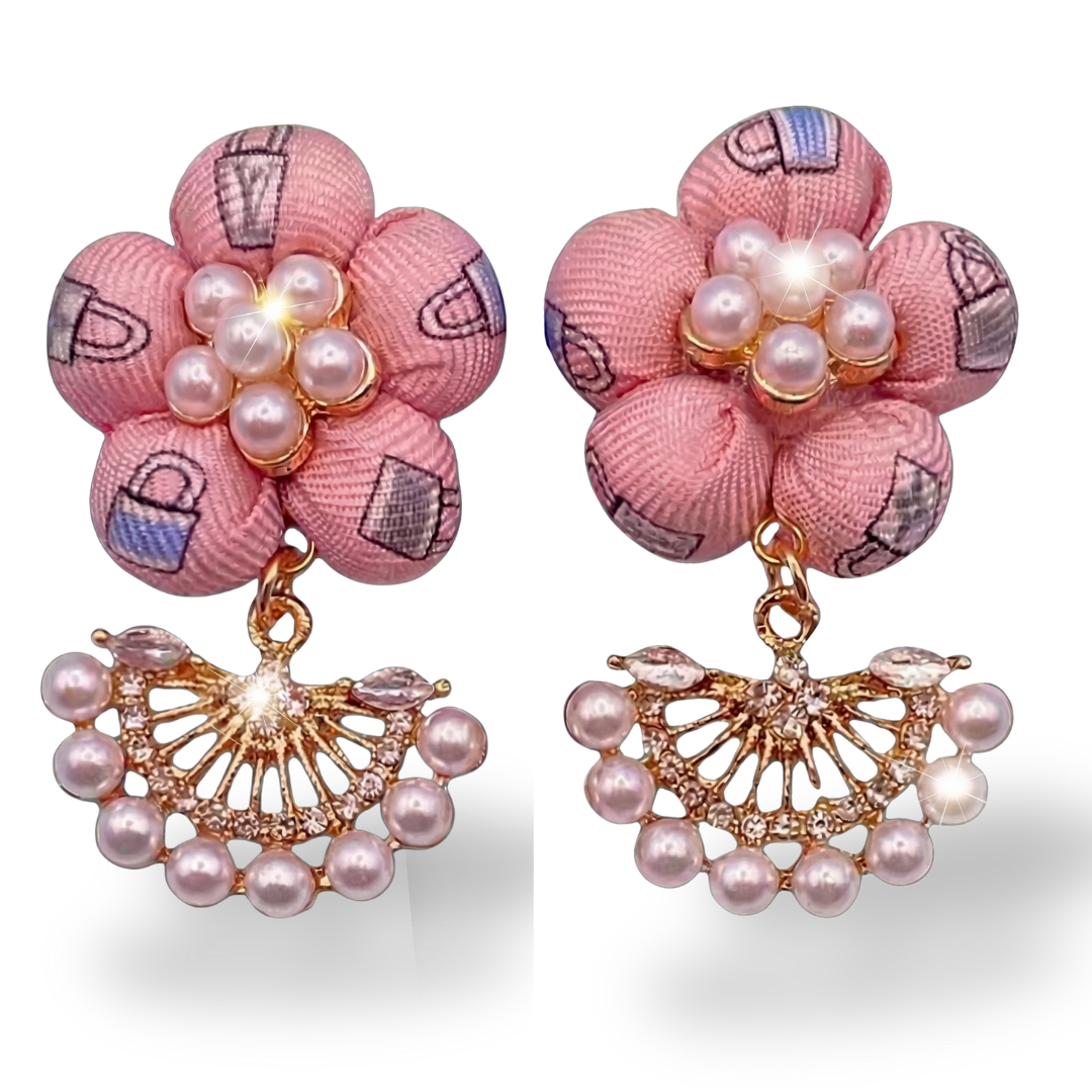 Vintage Louis Vuitton silk neckties paired with poly nylon pompoms, glass pearls, enamel and rhinestone flowers and hypoallergenic stainless-steel pierced earring posts.