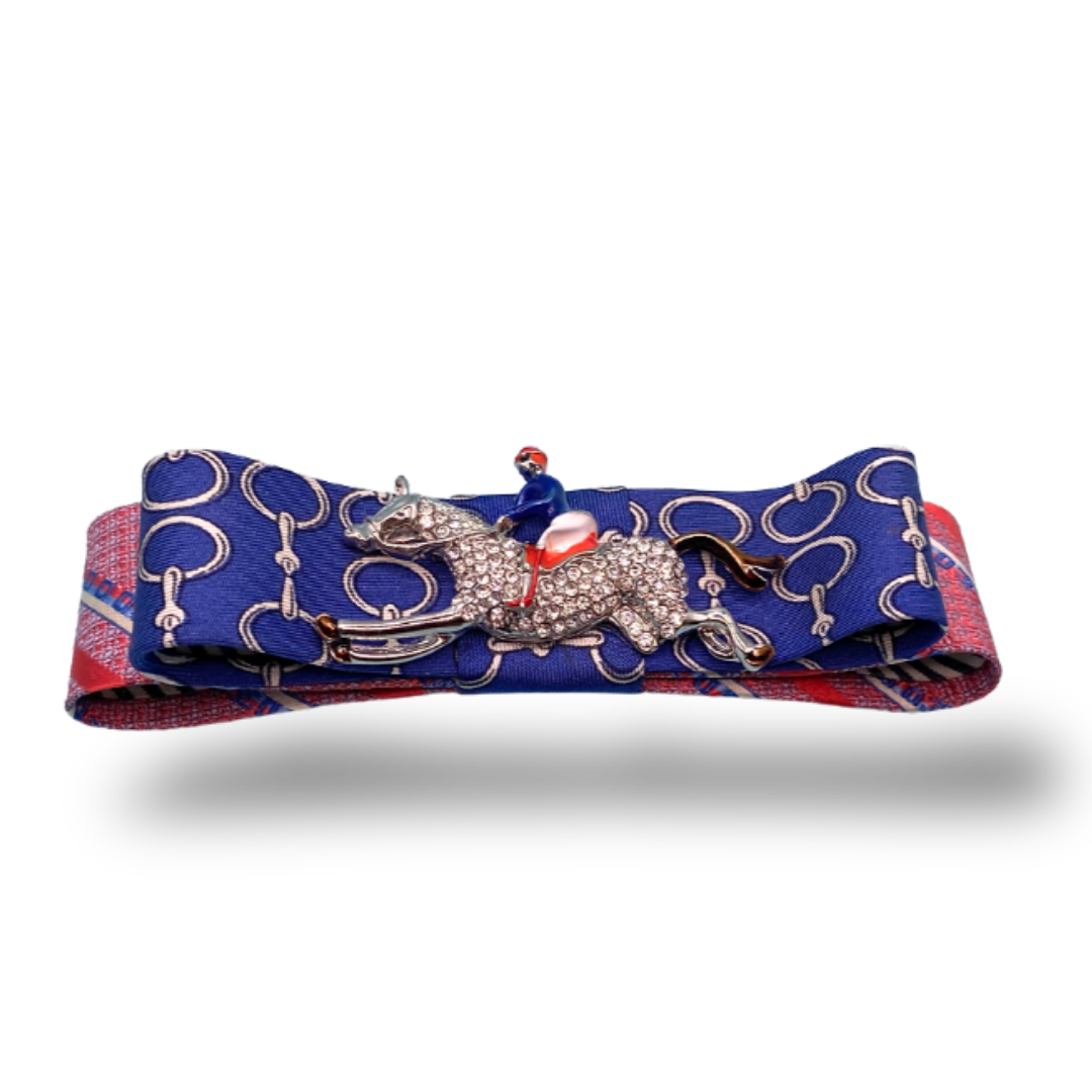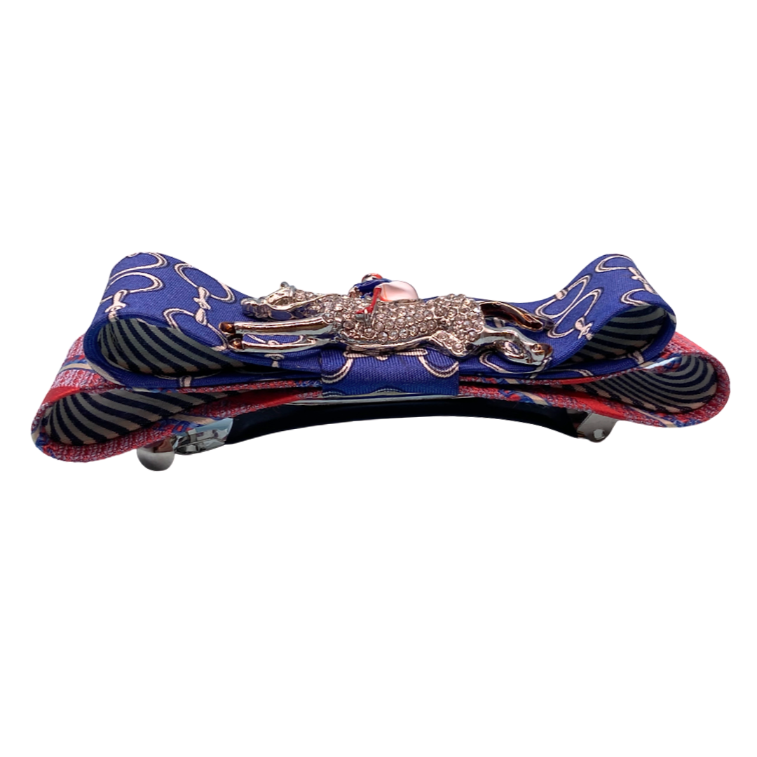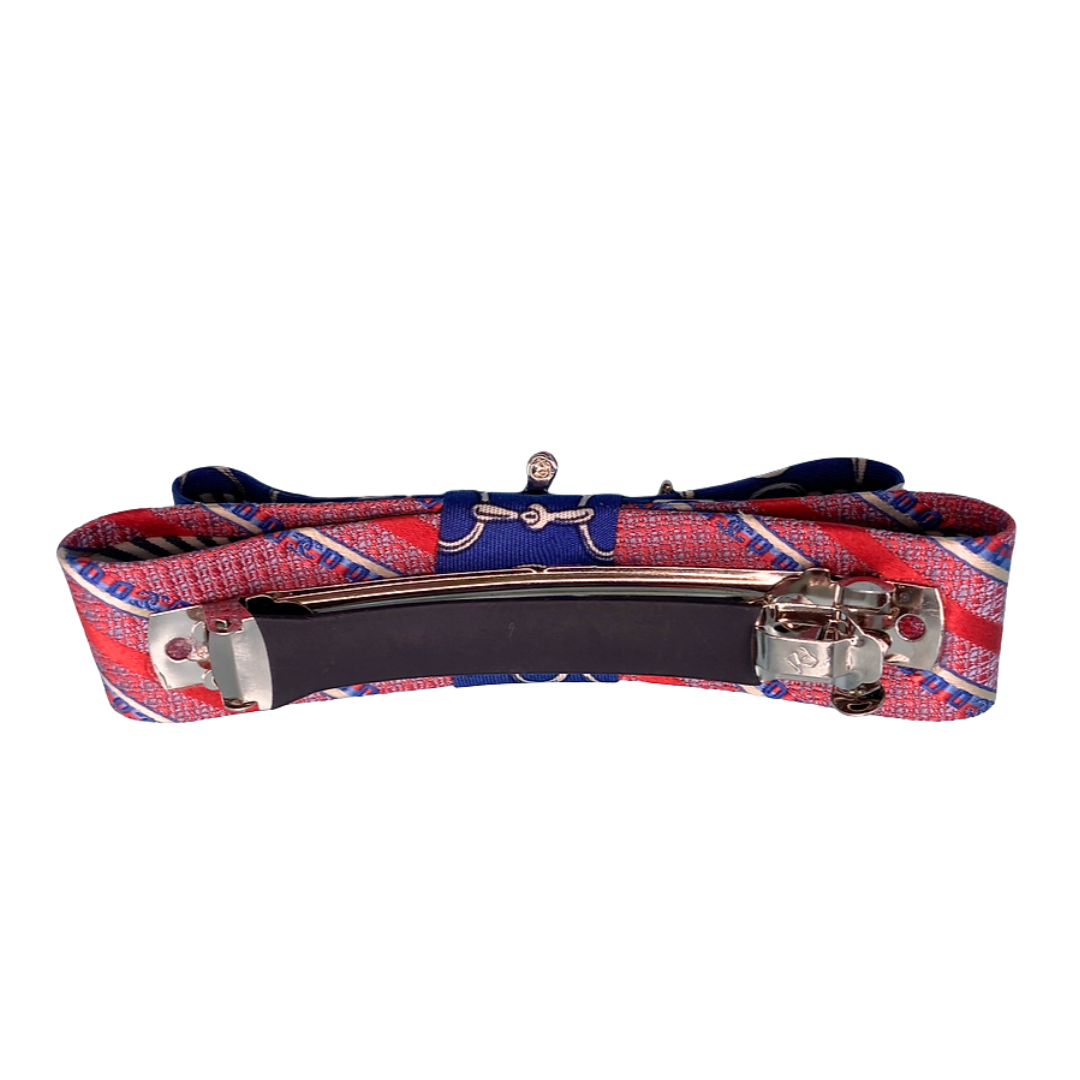 Vintage Chanel & Hermes silk neckties paired with polyester ribbon, rhinestone, and zinc alloy and stainless steel hair clip.