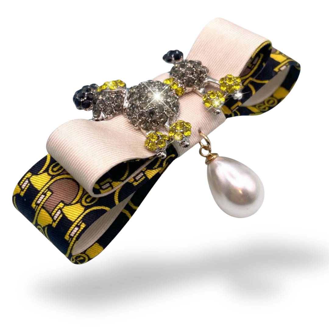 Vintage Hermès and Burberry silk neckties paired with rhinestone and zinc alloy poodle, glass pearl and stainless steel brooch clip.