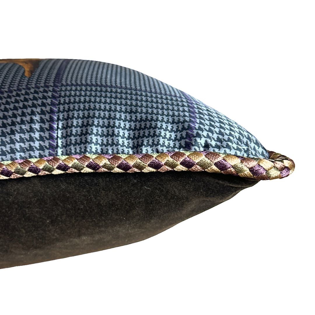 Vintage Ralph Lauren 100% silk scarf front paired with a brown velvet reverse and rope banding. Cotton inner-lining for extra strength and durability with a hidden zipper and our 10/90 down feather pillow insert.