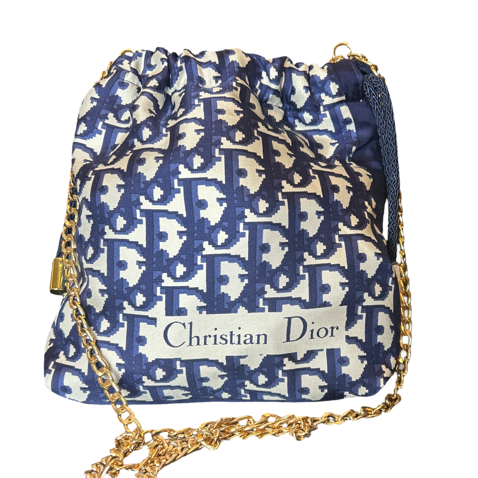Reimagined from the world’s finest collection of vintage Dior scarves, our drawstring bag is the ultimate accessory for your on-the-go lifestyle.  Uniquely convertible from a crossbody to a handheld bag with both removable goldtone chain and silky drawstring cord.