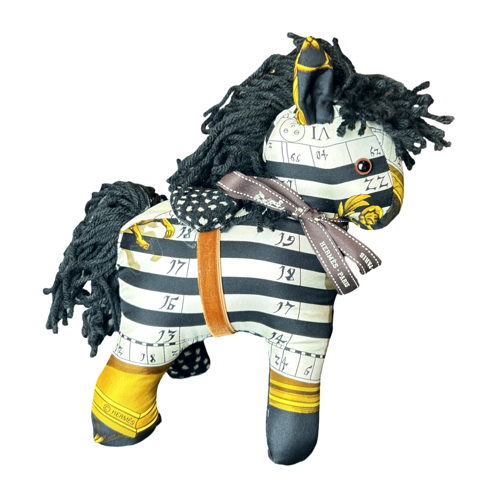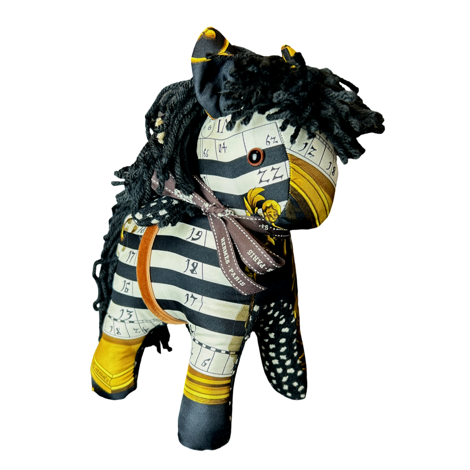 Vintage Hermès Astrologie Dies et Hors silk scarf paired with polka dot velvet cloth handmade into a one of a kind animal. Non-Allergenic polyfill stuffing. For decorative use only.