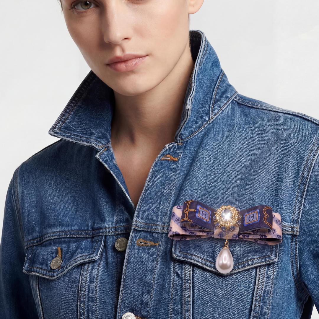 Vintage Chanel silk neckties paired with polyester ribbon, rhinestone, glass pearls and zinc alloy and stainless steel brooch clip.