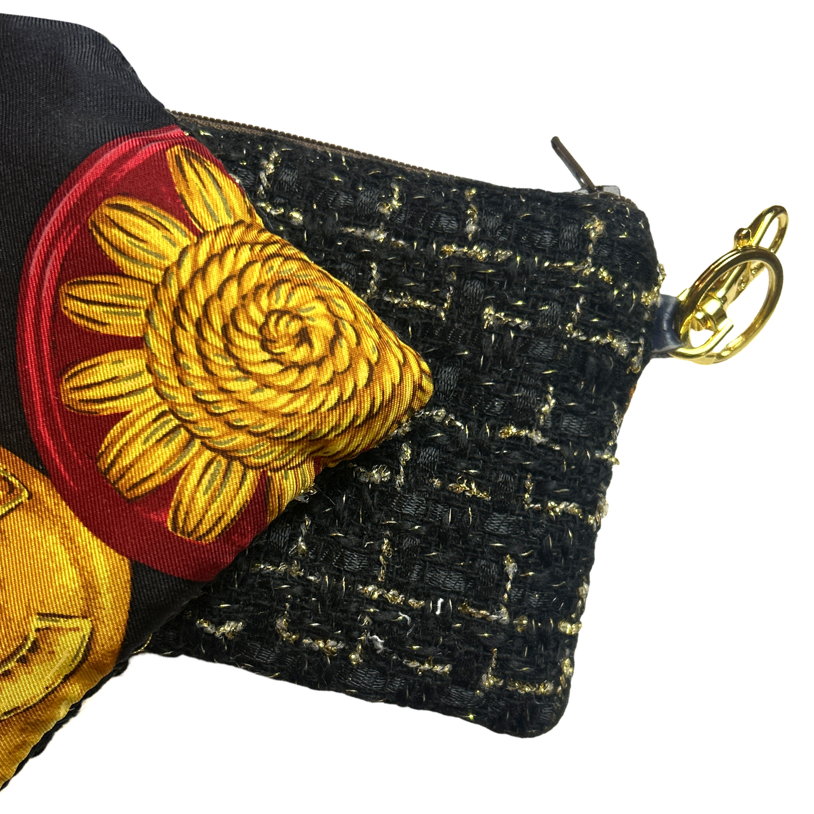 Vintage Chanel 100% silk scarf front with black & gold tweed reverse. Fully lined, zipper closure with removable gold-tone keychain and lobster clasp.