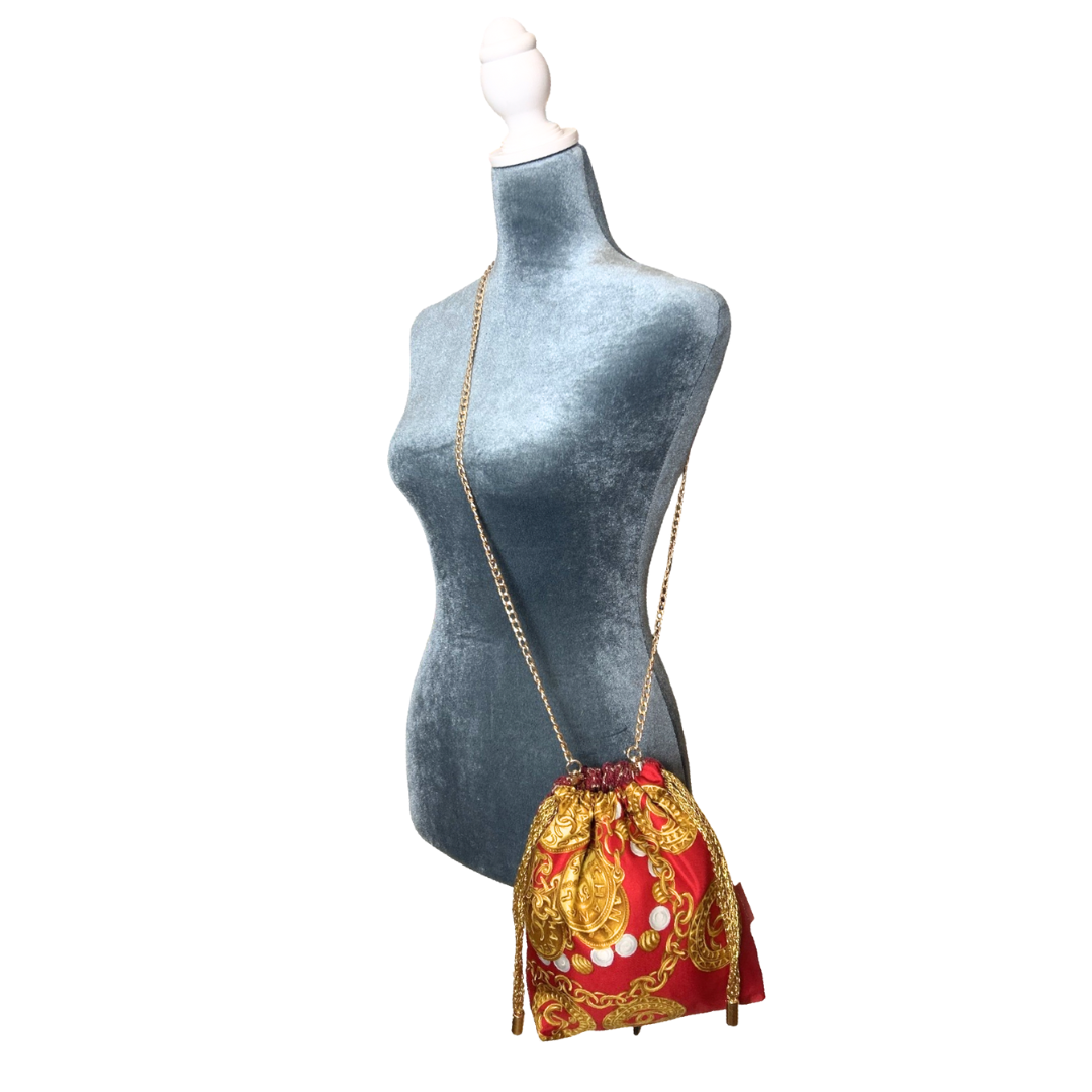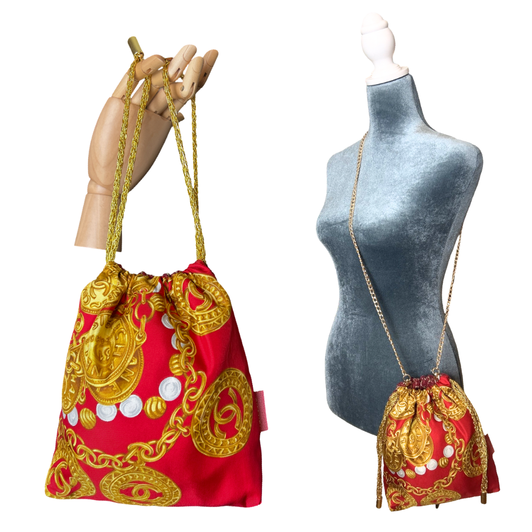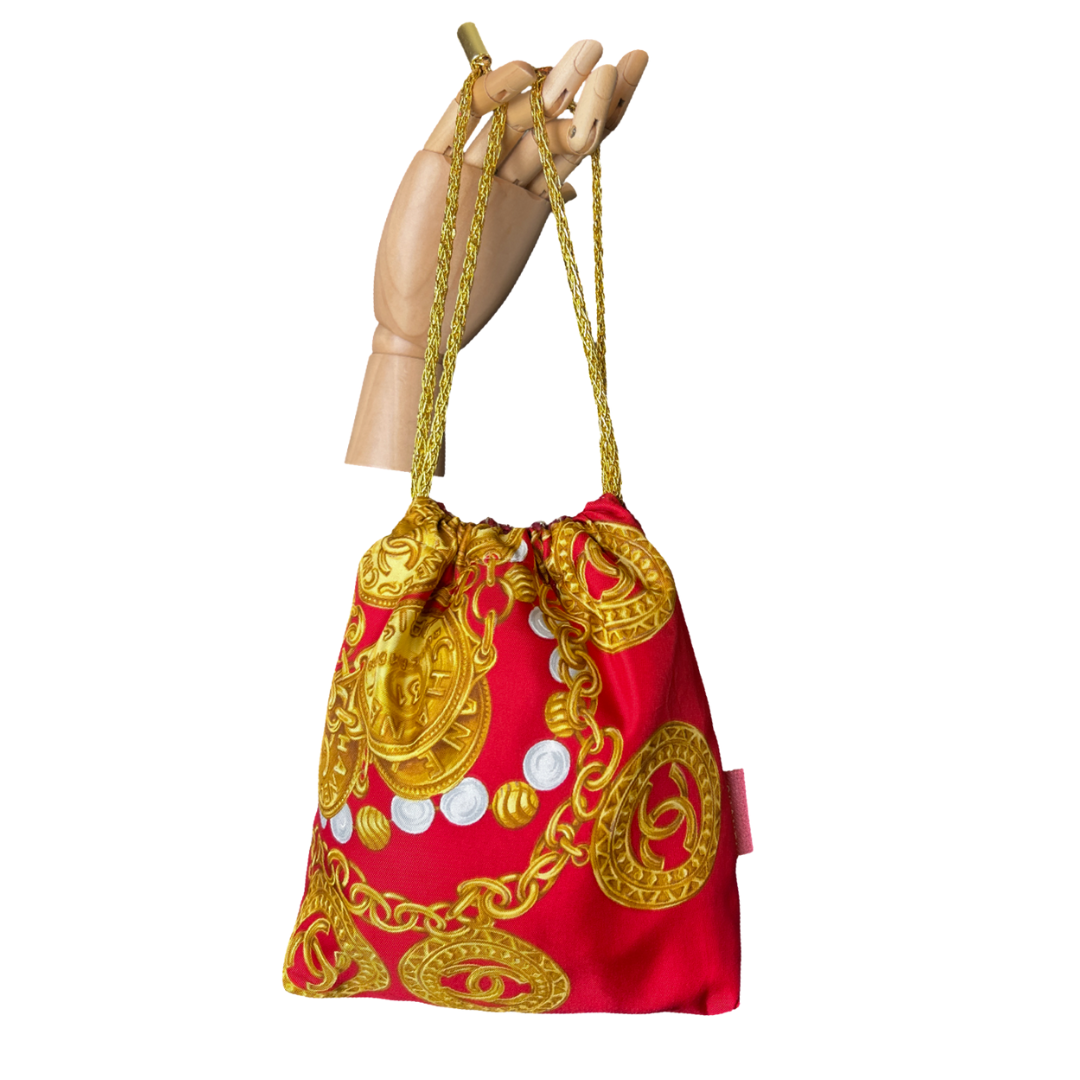 Reimagined from the world’s finest collection of vintage Chanel scarves, our drawstring bag is the ultimate accessory for your on-the-go lifestyle.  Uniquely convertible from a crossbody to a handheld bag with both removable goldtone chain and silky drawstring cord.