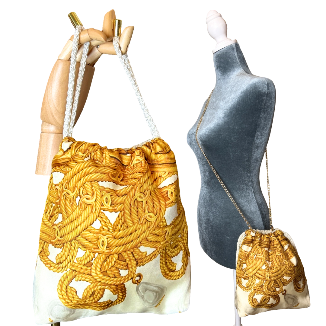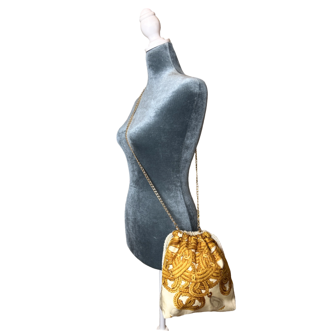 Reimagined from the world’s finest collection of vintage Chanel scarves, our drawstring bag is the ultimate accessory for your on-the-go lifestyle.  Uniquely convertible from a crossbody to a handheld bag with both removable goldtone chain and silky drawstring cord.