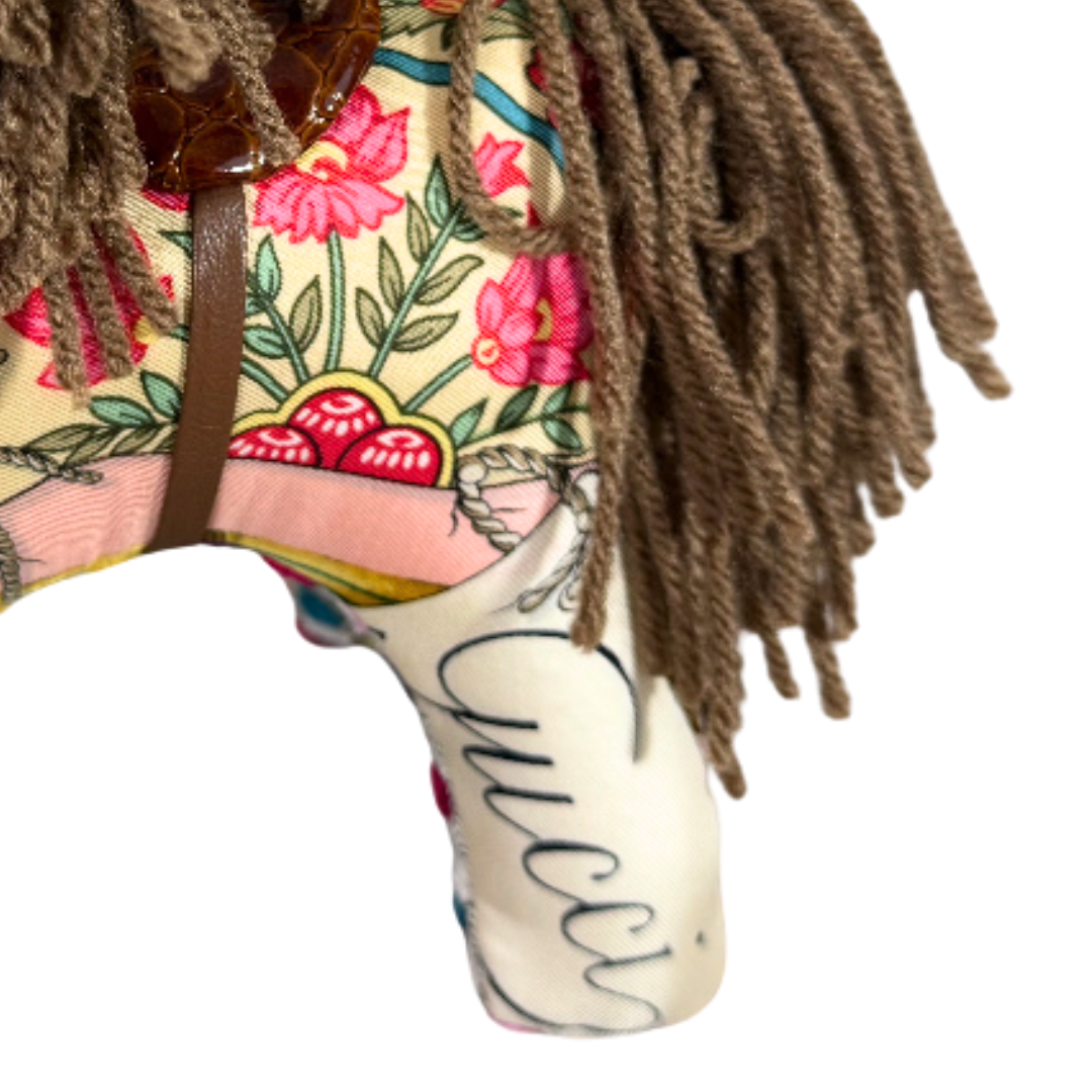 Vintage Gucci silk scarf paired with velvet cloth handmade into a one of a kind animal. Non-Allergenic polyfill stuffing. For decorative use only.