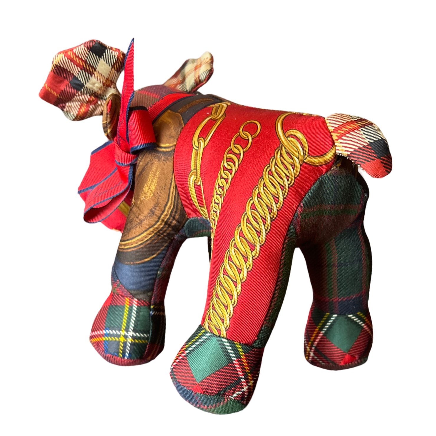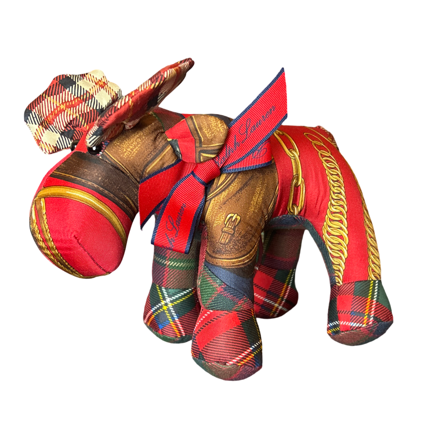 Vintage Ralph Lauren silk scarves paired with tartan plaid cloth handmade into a one of a kind animal. Non-Allergenic polyfill stuffing. For decorative use only.