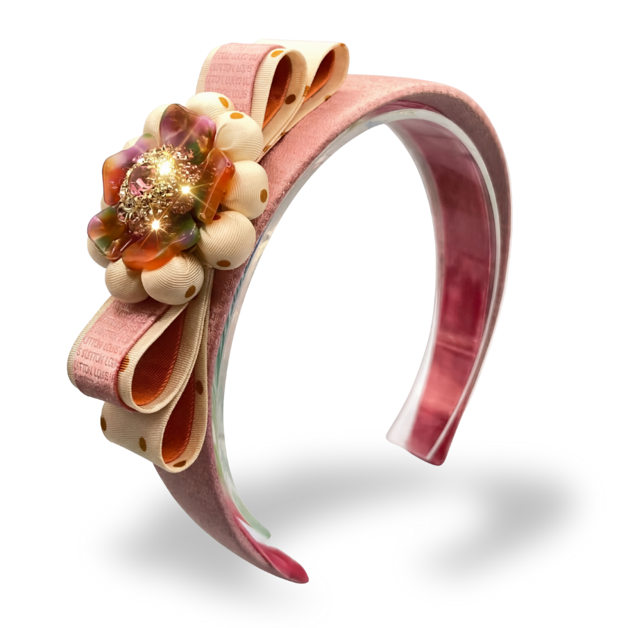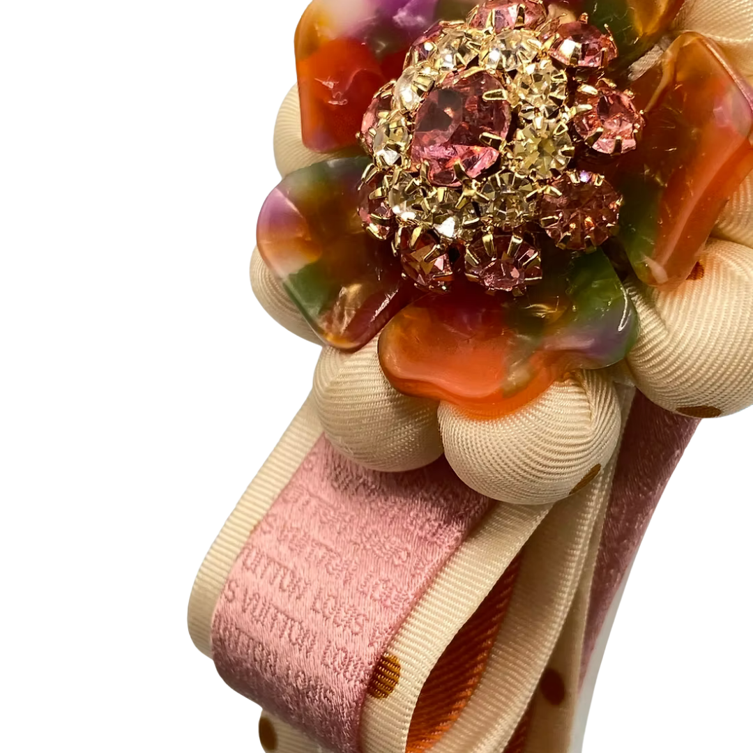 Vintage Louis Vuitton silk necktie paired with poly ribbon & pom poms, rhinestones, rare earth magnet, zinc alloy, faux tortoiseshell on an adjustable plastic headband frame.