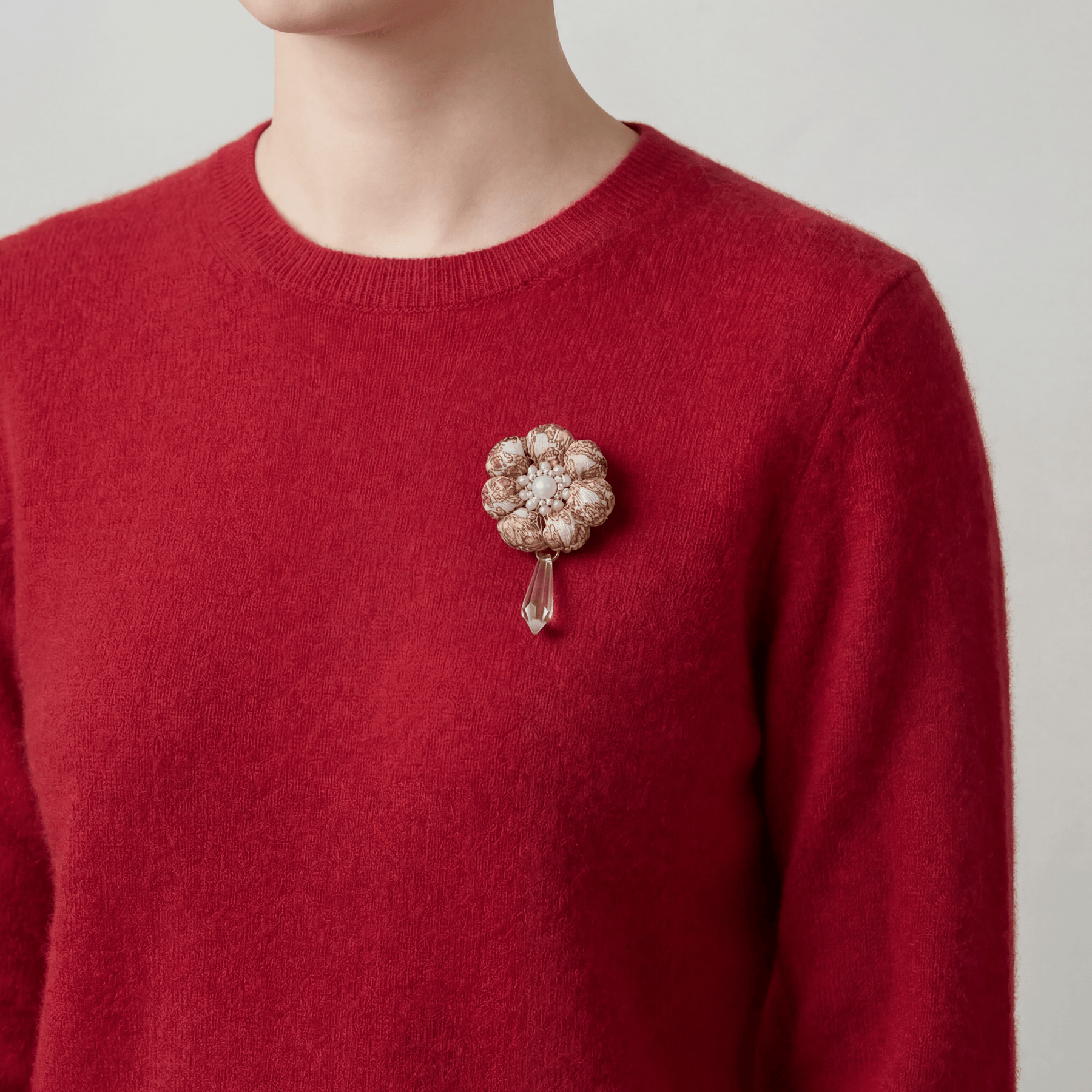 Vintage Hermès silk necktie paired with poly nylon pompoms, crystal glass, enamel, glass pearl and stainless steel brooch clip.
