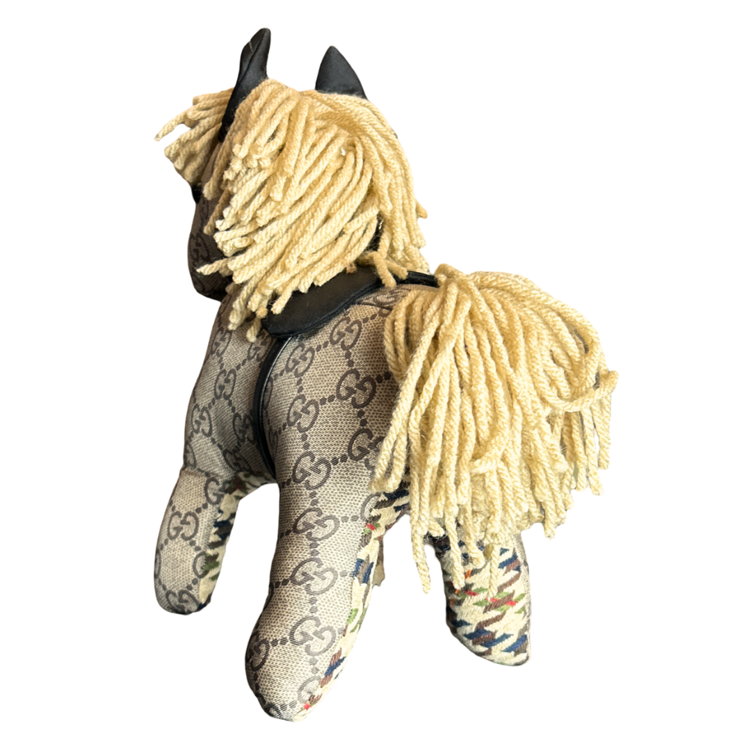 Vintage Gucci silk scarf paired with houndstooth plaid cloth handmade into a one of a kind animal. Non-Allergenic polyfill stuffing. For decorative use only.