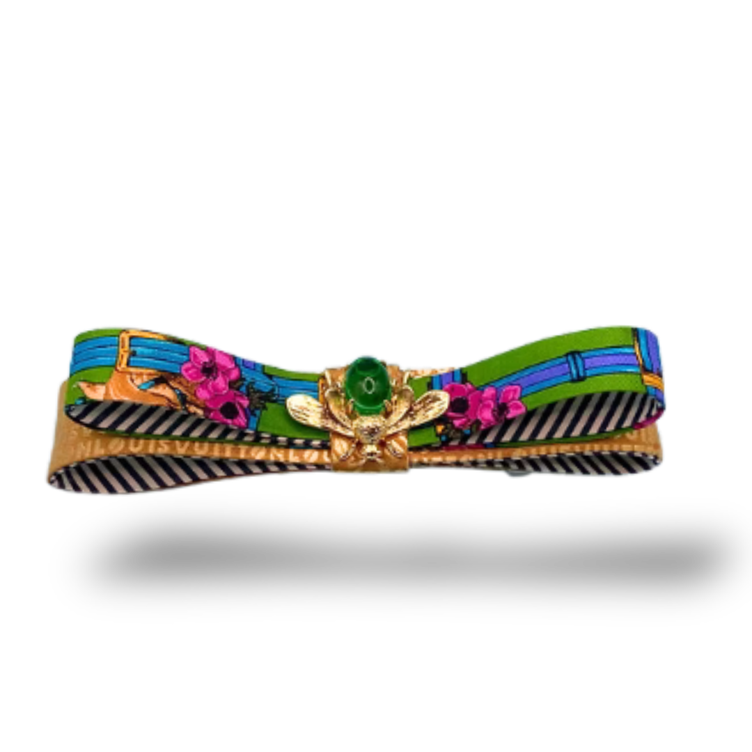 Vintage Gucci & Louis Vuitton silk neckties paired with polyester ribbon, rhinestone, glass pearls and zinc alloy and stainless steel hair clip.