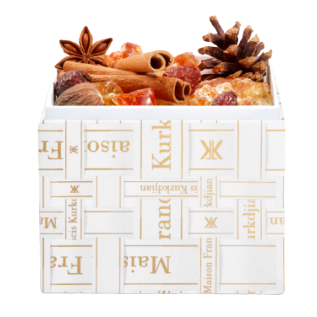 Francis Kurkdjian poetically reinvents the traditional potpourri with an elegant and wintery blend of scented ingredients. Pinecones, gum arabic, rose hips, star anise, nutmeg, eucalyptus nuts, and cinnamon sticks unfurl the woody, subtly resinous notes of Mon beau Sapin, evoking the picture of a cheerful walk with loved ones in a snowy forest.